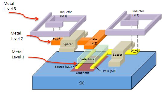 Η ομάδα του Αβούρη κατάφερε να ενώσει ένα τρανζίστορ γραφενίου κι ένα ζεύγος πηνίων επαγωγικής αντίστασης πάνω σε μια πλακέτα από καρβίδιο του πυριτίου.