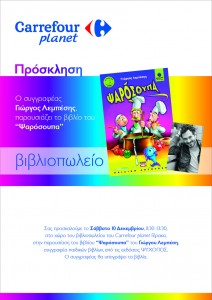Το Σάββατο 10/12, από τις 11.30-13.30, στο Carrefour planet στο Γέρακα, θα είναι μια ιδιαίτερη μέρα. Εκεί, όλα τα παιδιά, αλλά και οι γονείς, αφού γνωρίσουν το βιβλίο “Ψαρόσουπα” (εκδόσεις Ψυχογιός) θα πάρουν μέρος σε μια απίθανη περιπέτεια και μαζί με το συγγραφέα Γιώργο Λεμπέση θα αναλάβουν δράση.