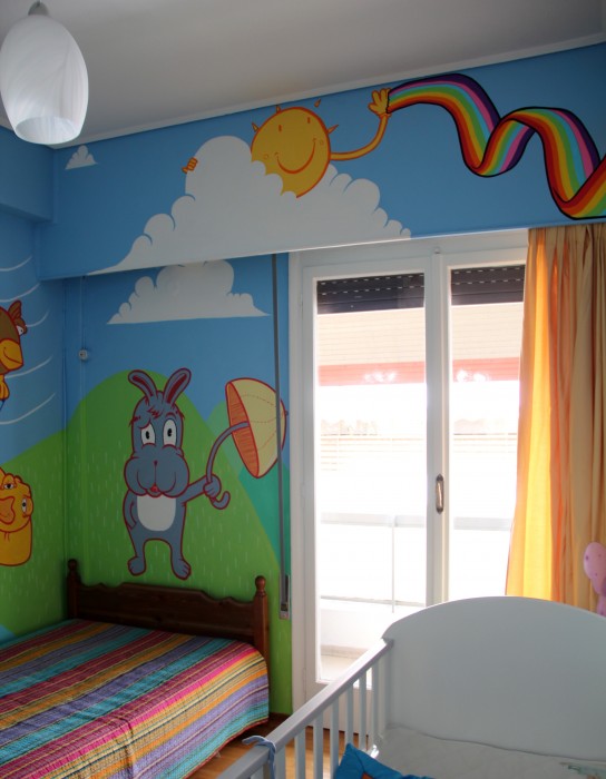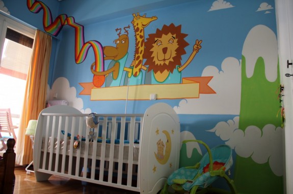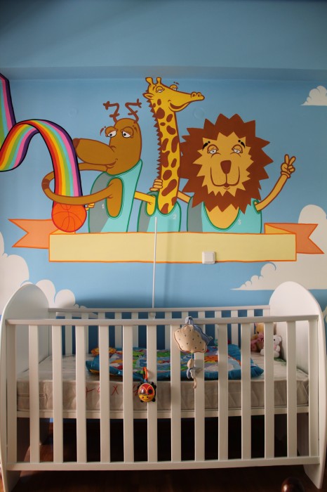 Ο Παναγιώτης και η Νατάσα είναι το πιο ήρεμο ζευγάρι που έχω συναντήσει. Η ιδέα τους για το δωμάτιο είχε να κάνει με ένα φυσικό τοπίο, όπου ο γιος τους θα μπορούσε να νοώθει ασφαλής και γαλήνιος. Το μπάσκετ, σαν αγαπημένο άθλημα του μπαμπά, και κάποια ψήγματα μουσικής ήταν επιθυμητά σαν αναφορές. Η τελική σύνθεση δεν ήταν τίποτα άλλο, παρά μια ωδή στην φιλία, την ενότητα και την ευγενή άμιλλα. Ένα σύμπαν που όλα θα βρίσκονται σε απόλυτη αρμονία. Τα ζώα, η μουσική, τα στοιχεία της φύσης, ο ήλιος, ο ουρανός. Το ομαδικό πνεύμα αποτέλεσε το σημαντικότερο συστατικό της τοιχογραφίας. Μικρέ Κωνσταντίνε, enjoy!