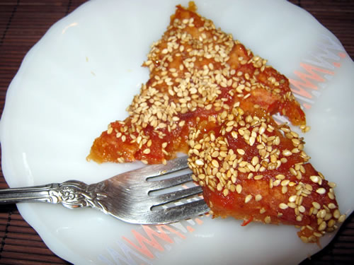 Λαδώνετε ένα ταψί και το πασπαλίζετε με σουσάμι και κανέλα. Ρίχνετε τη πολτοποιημένη σάρκα καρπουζιού στο ταψί, πασπαλίζετε με σουσάμι, κανέλα και προσθέτετε λίγο ελαιόλαδο. Ψήνετε την πίτα στους