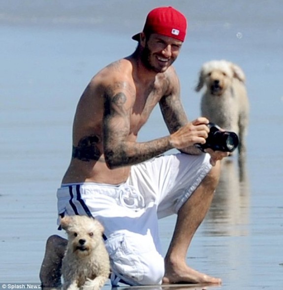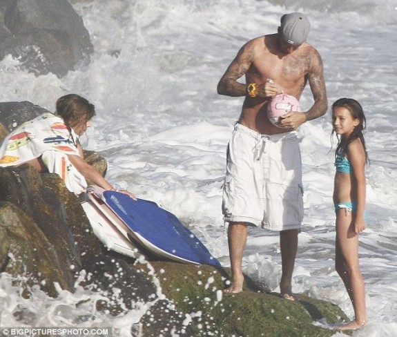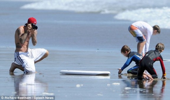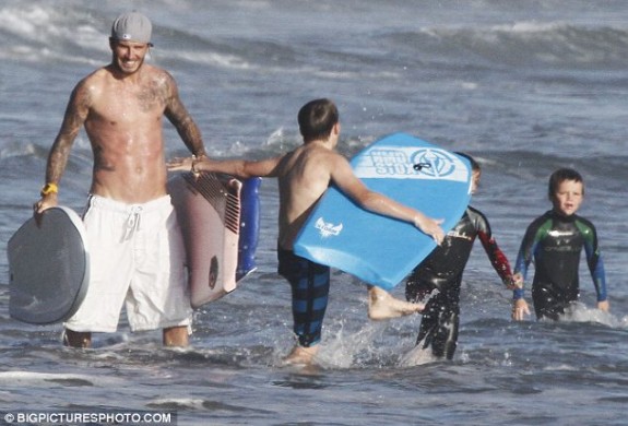 Στην παραλία Μαλιμπού του Λ.Α., οι λουόμενοι έχασαν το μπάνιο τους γιατί θαύμαζαν τον πανέμορφο ποδοσφαιριστή – μοντέλο – σύζυγο της Βικτώριας, να επιδεικνύει τους τετρακέφαλούς του, δαμάζοντας τα κύματα.