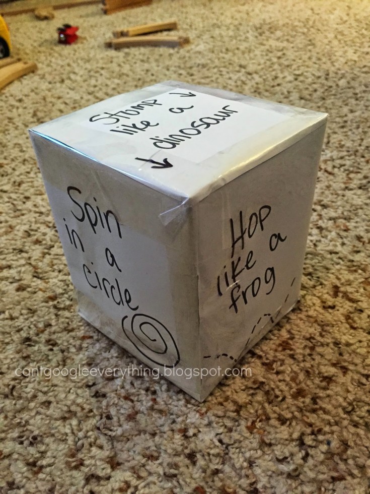 Στις πλευρές ενός τετράγωνου χαρτόκουτου γράψτε πάνω μερικές εντολές και πείτε στο παιδί να το αναποδογυρίσει. Όποια εντολή βρίσκεται τώρα στην πάνω πλευρά είναι εκείνη που πρέπει να εκτελεστεί. Μπορείτε να σημειώσετε εντολές όπως: «Χόρεψε», «Στριφογύρισε» ή «Πήδα σαν τα καγκουρό». Φυσικά, με αυτό το παιχνίδι μπορείτε να κάνετε το παιδί σας να σας βοηθήσει και στις δουλειές του σπιτιού…