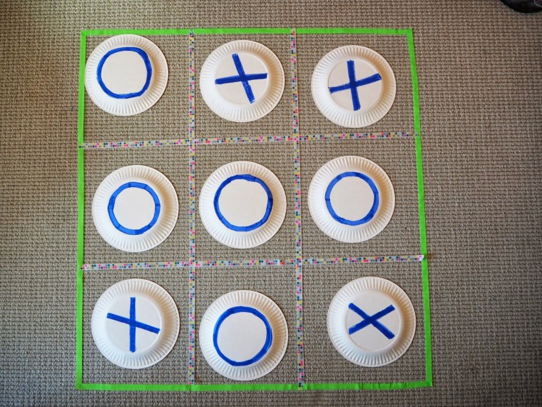 Αγαπημένο παιχνίδι όλων! Τώρα, μεταφέρεται και στο πάτωμα! Σχηματίστε τετράγωνα στο πάτωμα και γράψτε στο πίσω μέρος πλαστικών πιάτων «Χ» και «Ο». Εξηγήστε στα παιδιά το παιχνίδι, αν δεν το γνωρίζουν ήδη, και ξεκινήστε…