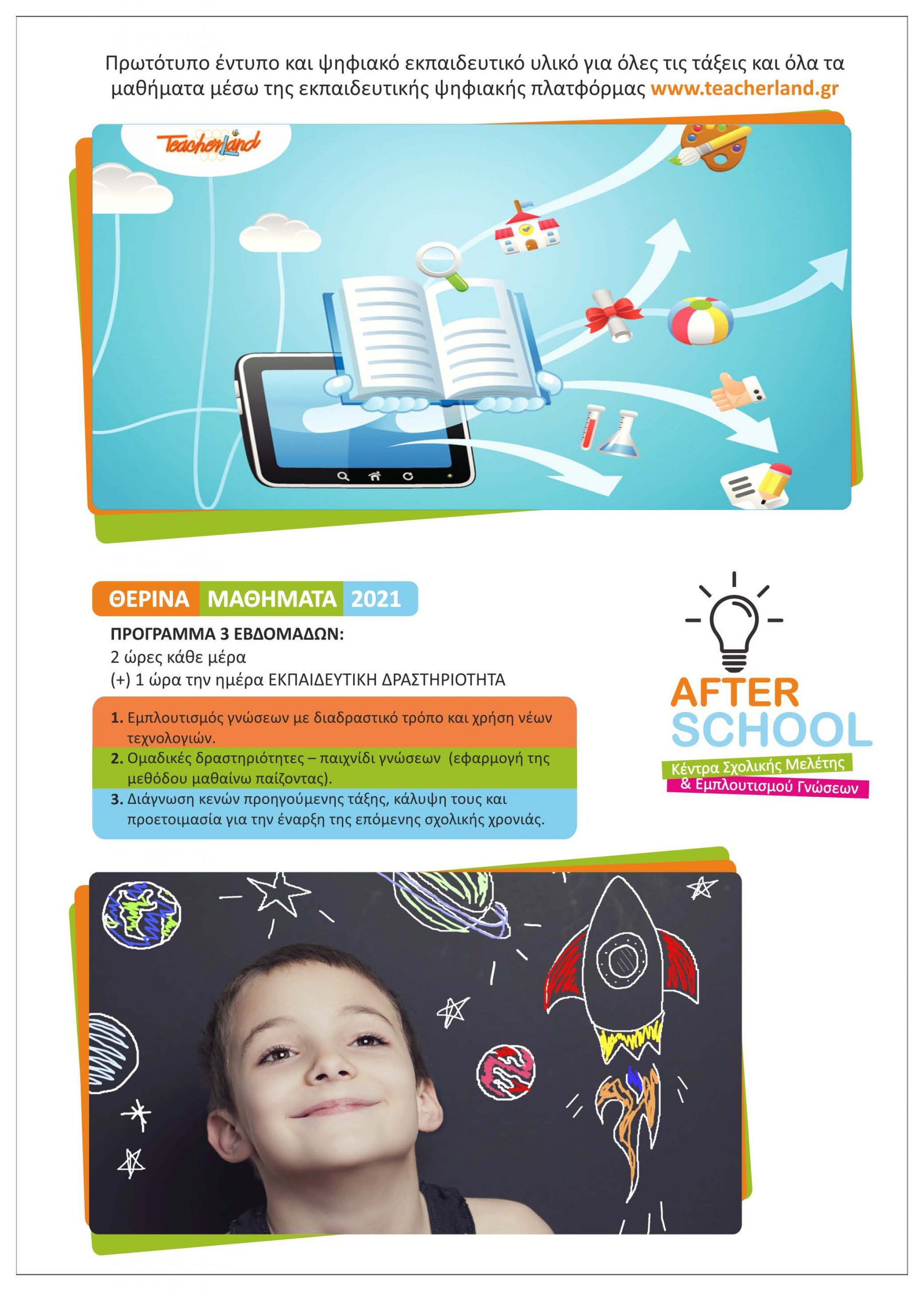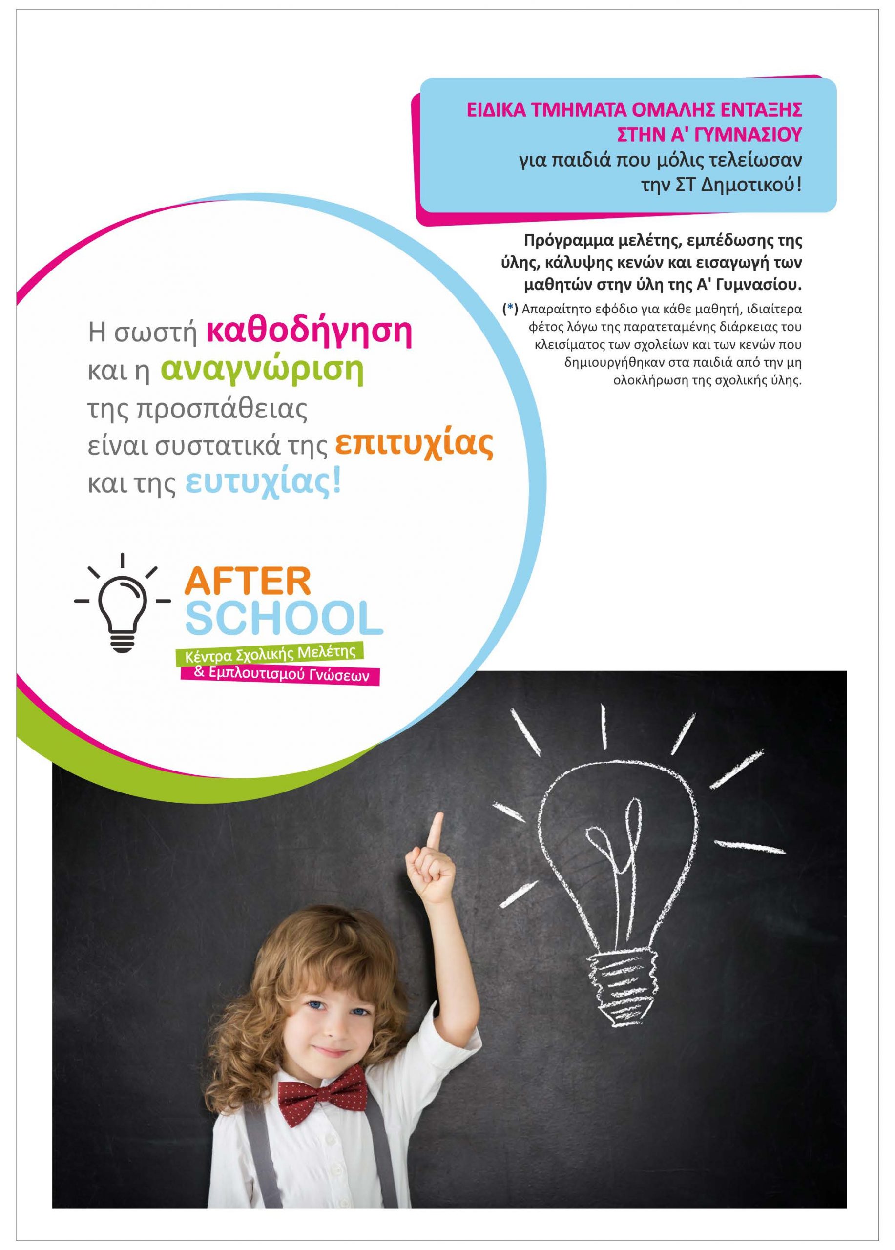 Τα Κέντρα Σχολικής Μελέτης και Εμπλουτισμού Γνώσεων AFTER SCHOOL του Ομίλου ΦΜΕ ΔΙΑΚΡΟΤΗΜΑ διαθέτουν το πιο ολοκληρωμένο και πρωτοποριακό πρόγραμμα εξωσχολικής εκπαίδευσης για μαθητές δημοτικού.