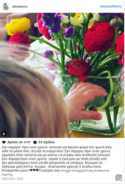 Σήμερα κλείνει έναν χρόνο ζωής η μικρούλα της, η κόρη της Θάλεια, και η Ζέτα Δούκα ήθελε να μοιραστεί αυτή την ευτυχία αλλά και τα υπόλοιπα δυνατά συναισθήματά της με τους διαδικτυακούς της φίλους μαζί με μία φωτογραφία της κορούλας της.