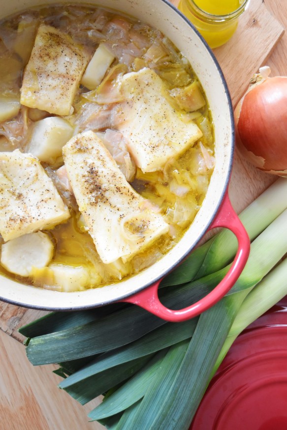 Ρίχνετε το λάδι στην κατσαρόλα και προσθέτετε τα κρεμμύδια να τσιγαριστούν. Στη συνέχεια προσθέτετε τα πράσα, τα κλωναράκια του σέλινου, το φρέσκο κρεμμύδι, το ζεστό νερό, σκεπάζετε την κατσαρόλα και αφήνετε για λίγο να μαραθούν τα υλικά. Προσθέτετε τις πατάτες σε στρώσεις πάνω από τα λαχανικά και προσθέτετε και άλλο ζεστό νερό μέχρι να τις σκεπάσετε. Ρίχνετε άσπρο πιπέρι, σκεπάζετε την κατσαρόλα και αφήνετε για 10 λεπτά. Προσθέτετε τα κομμάτια του μπακαλιάρου και αφήνετε το φαγητό να μαγειρεύεται, ενώ παράλληλα ετοιμάζετε το χυλό: Σε ένα μπολ, βάζετε το χυμό από τα λεμόνια, το αλεύρι και χτυπάτε μέχρι να γίνουν χυλός. Προσθέτετε 3 κουταλιές ζωμό από την κατσαρόλα που βράζει το φαγητό και ανακατεύετε. Ύστερα από περίπου 5 λεπτά, προσθέτετε το χυλό στην κατσαρόλα, ανακινείτε καλά τη κατσαρόλα και σερβίρετε.