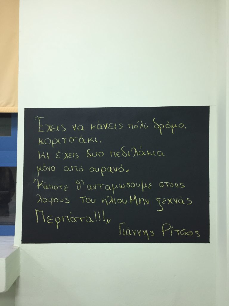 Εμπνευστήκαμε από την δύναμη της ποίησης και την χαρίσαμε απλόχερα στα παιδιά μας ελπίζοντας πως θα νοιώσουν ελεύθερα, δυνατά και δημιουργικά. Το σχολείο μας γέμισε με στίχους ποιητών. Σε κάθε τάξη γράφτηκαν στίχοι ποιημάτων σημαντικών Ελλήνων ποιητών ώστε διαβάζοντάς τους τα παιδιά να εμπνέονται , να ελπίζουν και να παλεύουν για την ομορφιά .