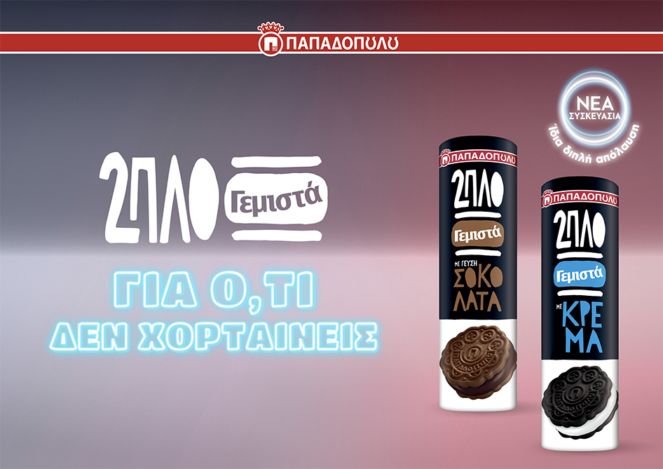 Οι συσκευασίες 2πλο Γεμιστών Παπαδοπούλου ανατρέπουν όσα γνωρίζαμε για το αγαπημένο brand, αφού πλέον κυκλοφορούν με έντονα χρώματα και ανανεωμένο λογότυπο που διαβάζεται οριζόντια αλλά και κάθετα! Η πρωτότυπη αυτή εμφάνιση χαρίζει στις συσκευασίες 2πλο Γεμιστών ένα ακόμα πιο φρέσκο και μοντέρνο ύφος που ταιριάζει απόλυτα στο αγαπημένο brand των νέων και όχι μόνο. Παράλληλα διατηρούν την ίδια απίθανη 2πλη γέμιση στις δυο ξεχωριστές γεύσεις Σοκολάτα και Κρέμα που δεν «χορταίνεις» να απολαμβάνεις.