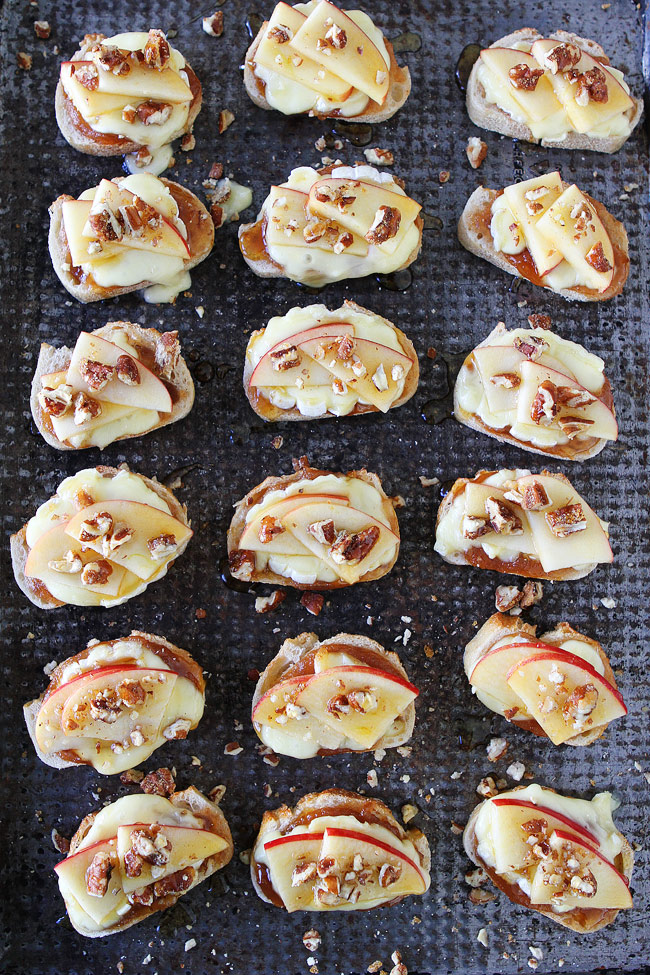 Προθερμάνετε τον φούρνο στους 180ο. Απλώστε λίγο apple butter – περίπου 1 με 2 κουταλιές – στην μία πλευρά των φετών του ψωμιού και τοποθετήστε τις πάνω σε ένα ταψί στρωμένο με χαρτί ψησίματος. Στη συνέχεια κόψτε το τυρί σε λεπτές φέτες, τοποθετήστε το πάνω στις φέτες του ψωμιού και ψήστε για 5-10 λεπτά – μέχρι το τυρί να λιώσει.