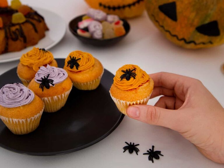 Ψήστε απλά σοκολατένια muffins και προσθέστε επάνω διακοσμητικές αράχνες ή βρώσιμες με σοκολάτα. Διακοσμήστε με κρέμες και έτοιμοι!