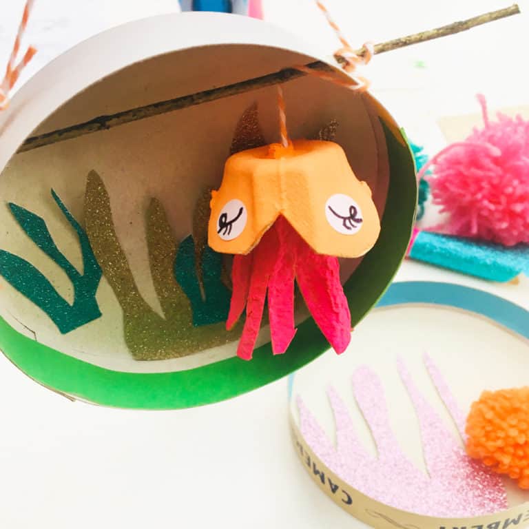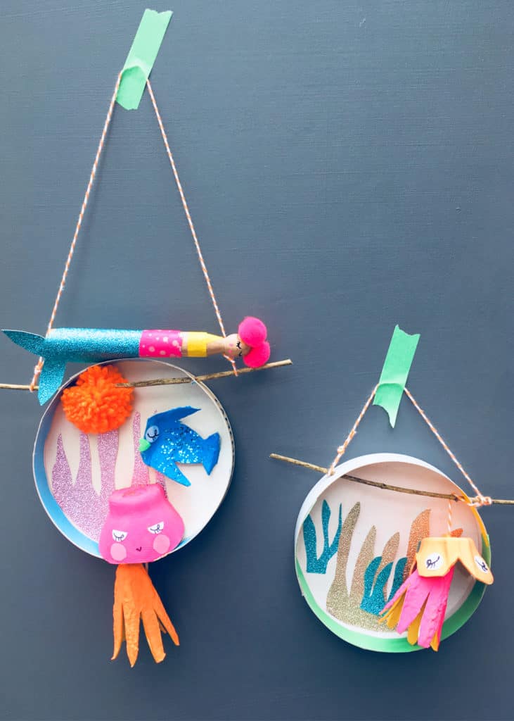 Πώς θα τα φτιάξετε: Κόψτε τα στρογγυλά σημεία από της θήκες των αυγών για να φτιάξετε το σώμα για τα χταπόδια και τα καλαμάρια. Φτιάξτε με το ψαλίδι τα πόδια. Τα άλλα σημεία των θηκών μπορούν να γίνουν μικρά ψαράκια. Χρωματίστε με νερομπογιές τα θαλάσσια πλάσματα του ενυδρείου σας και αφήστε τα να στεγνώσουν καλά. Κόψτε σε διάφορα σχέδια και σχήματα -σχετικά με τη θάλασσα- τα χρωματιστά χαρτόνια.