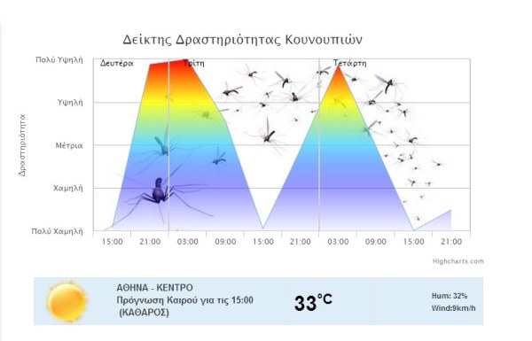 Δείτε την δραστηριότητα των κουνουπιών στην περιοχή σας πατώντας στον ακόλουθο σύνδεσμο https://www.conops.gr/weather/ και επιλέγοντας το νομό και την πόλη στη οποία υπάγεστε.
