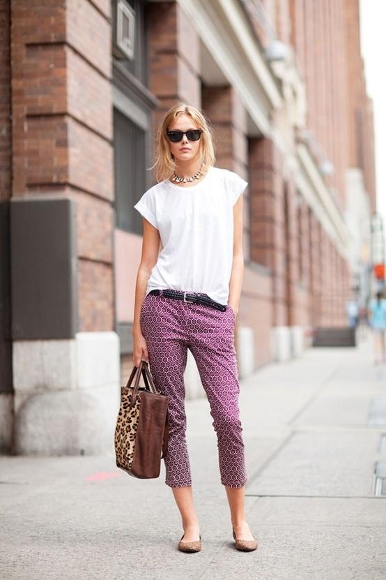2. Διάλεξε ένα χρωματιστό ή με prints cropped παντελόνι και φόρεσέ το με ένα λευκό t-shirt.
