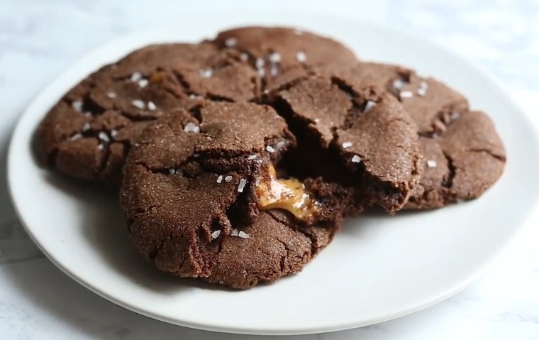 Μπορεί να σας φαίνεται παράλογο να συνδυάσετε όλες αυτές τις γεύσεις σε μία συνταγή, αλλά θα διαπιστώσετε ότι η καραμέλα, η κανέλα και η σοκολάτα, όταν συνδυάζονται μαζί κάνουν τα καλύτερα μπισκότα που έχετε δοκιμάσει ποτέ! Κομμάτια καραμέλας τυλίγονται σε σοκολατένια ζύμη, ψήνονται και γαρνίρονται με χοντρό αλάτι, δημιουργώντας έναν απροσδόκητο γευστικό συνδυασμό!