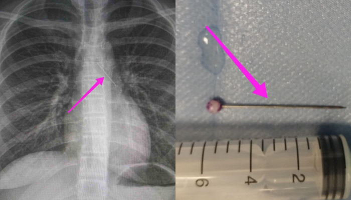 “Χθες 30/1/2022 στις 16:00 στο Τ.Ε.Π. του ΓΝΘ Ιπποκράτειο, προσήλθε ανήλικη συνοδευόμενη από τους γονείς της, μετά από αναφερόμενη κατάποση ξένου σώματος (καρφίτσα). Από την απεικονιστική διερεύνηση που πραγματοποιήθηκε με ακτινογραφία θώρακος αρχικά και ακολούθως με αξονική τομογραφία θώρακος, διαπιστώθηκε η ύπαρξη αιχμηρού μεταλλικού ξένου σώματος στην αναπνευστική οδό (αριστερός κύριος βρόγχος) και όχι στην πεπτική οδό.
