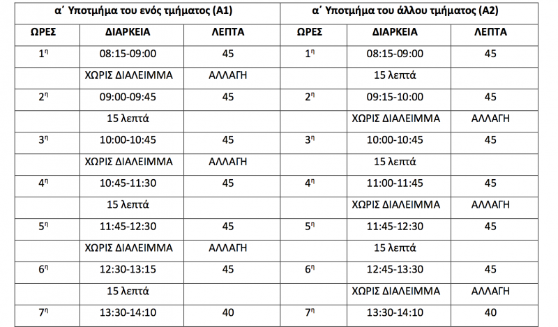 Προτείνεται η υιοθέτηση του ακόλουθου ωραρίου διαλειμμάτων για κάθε υποτμήμα εκάστου τμήματος.