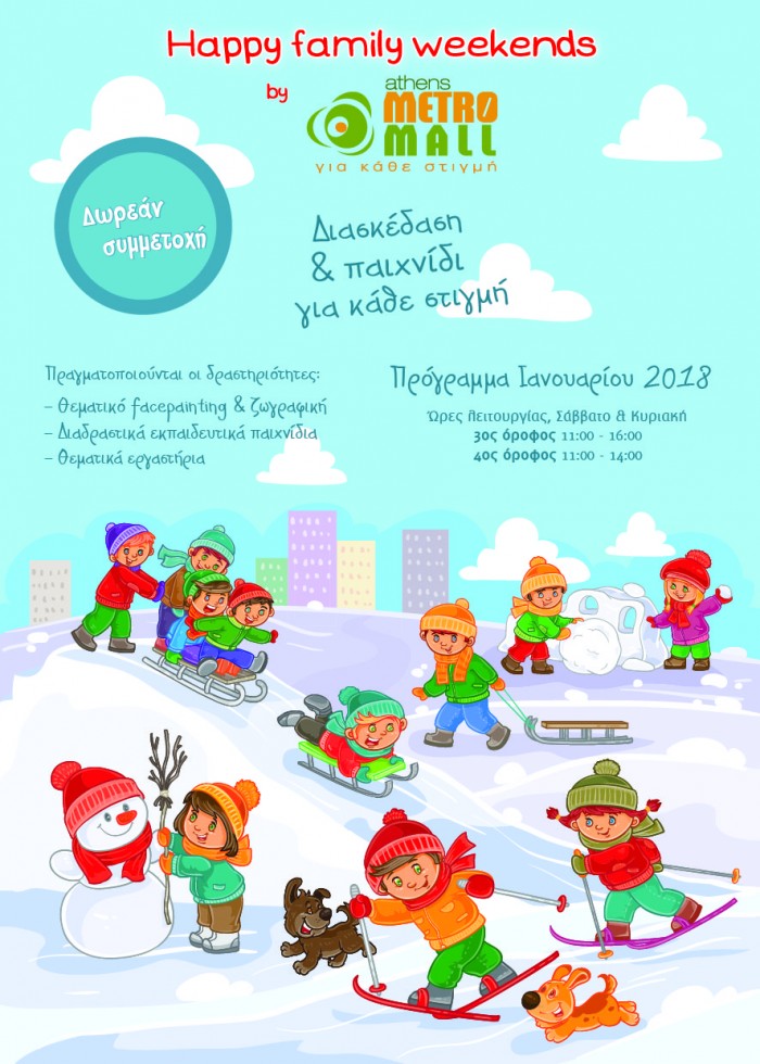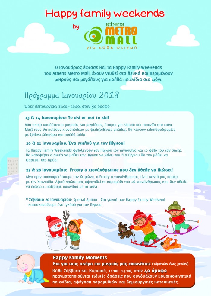 Από τις 13 Ιανουαρίου και κάθε Σάββατο και Κυριακή, τα Happy Family Weekends υποδέχονται ξανά μικρούς και μεγάλους στον 3ο όροφο του ATHENS METRO MALL! Από τις 11.00 έως τις 16.00 -και με ελεύθερη είσοδο- τα Happy Family Weekends του Ιανουαρίου ντύνονται στα λευκά και περιμένουν όλη την οικογένεια για πολλά παιχνίδια στο χιόνι. Χιονοπόλεμος με φελιζολένιες μπάλες, ελκηθροδρομίες με ξύλινα έλκηθρα, κατασκευές Ιγκλού, παραμύθια και πολλές – πολλές ακόμη εκπλήξεις θα διασκεδάσουν μικρούς και μεγάλους!