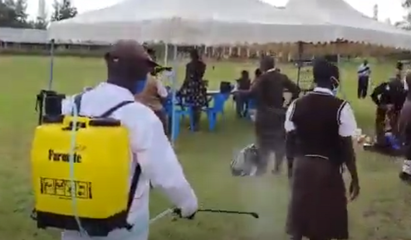 Στο βίντεο που ανέβασε στο Twitter τοπική εφημερίδα της Κένυας, διακρίνεται ένας άνδρας με στολή προστασίας να ψεκάζει με μια ουσία τα χέρια, τα πόδια και τις στολές μαθητριών που περιμένουν στη σειρά στο πλαίσιο των μέτρων ανάσχεσης της πανδημίας που καλπάζει και στην Αφρική.