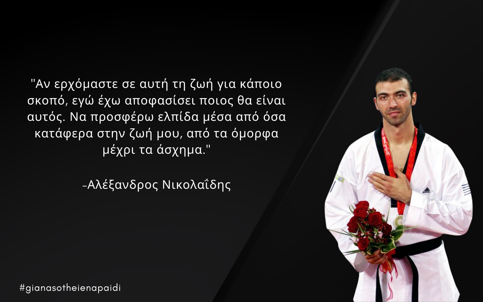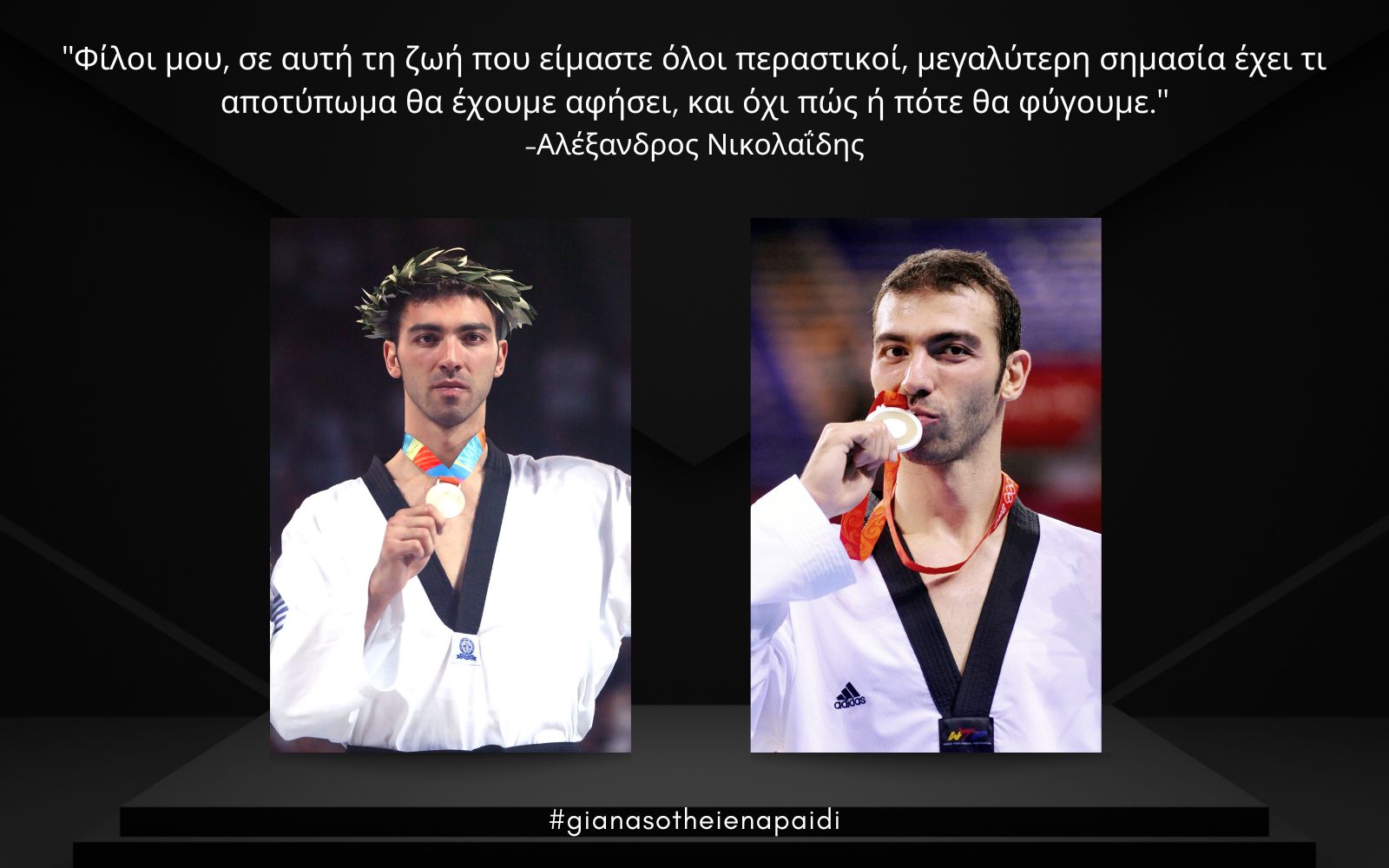 Στις 14 Οκτωβρίου 2022, ο κόσμος μας έγινε πιο φτωχός, όταν αποχαιρετήσαμε τον άνθρωπό μας, έναν σπουδαίο πατέρα, σύντροφο, γιο και αδελφό, έναν κορυφαίο αθλητή πρότυπο, τον δις αργυρό Ολυμπιονίκη του Τae Κwon Do Αλέξανδρο Νικολαΐδη.