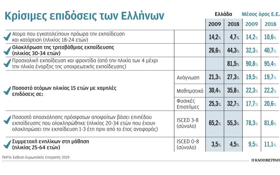 - Η Ελλάδα είναι πολύ καλύτερα από την Ευρώπη στην πρόωρη εγκατάλειψη των σπουδών από φοιτητές ηλικίας 18 έως 24 ετών. Το ελληνικό ποσοστό είναι 4,7% και ο ευρωπαϊκός μέσος όρος 10,6%.