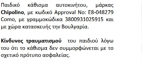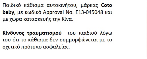 Για την ανάκληση παιδικών καθισμάτων αυτοκινήτου ενημερωθήκαμε μέσω του μέσω των Κοινοποιήσεων της Ευρωπαϊκής Επιτροπής για την τρέχουσα εβδομάδα (10/05/2019) για τα µη ασφαλή προϊόντα του Συστήµατος Ταχείας Ανταλλαγής Πληροφοριών (RAPEX).