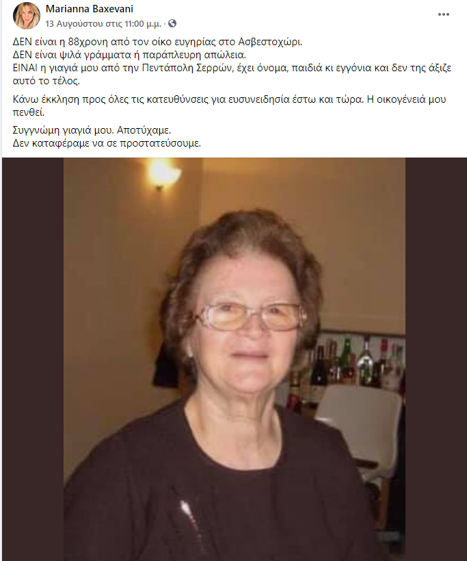 Με μεγάλη λύπη και συγκίνηση διαβάσαμε το μήνυμα μιας νέας γυναίκας, της κ. Μαριάννας Μπαξεβάνη, η οποία πριν από λίγο καιρό έχασε την 88χρονη γιαγιά της, από την Πεντάπολη Σερρών, από κορωνοϊό: