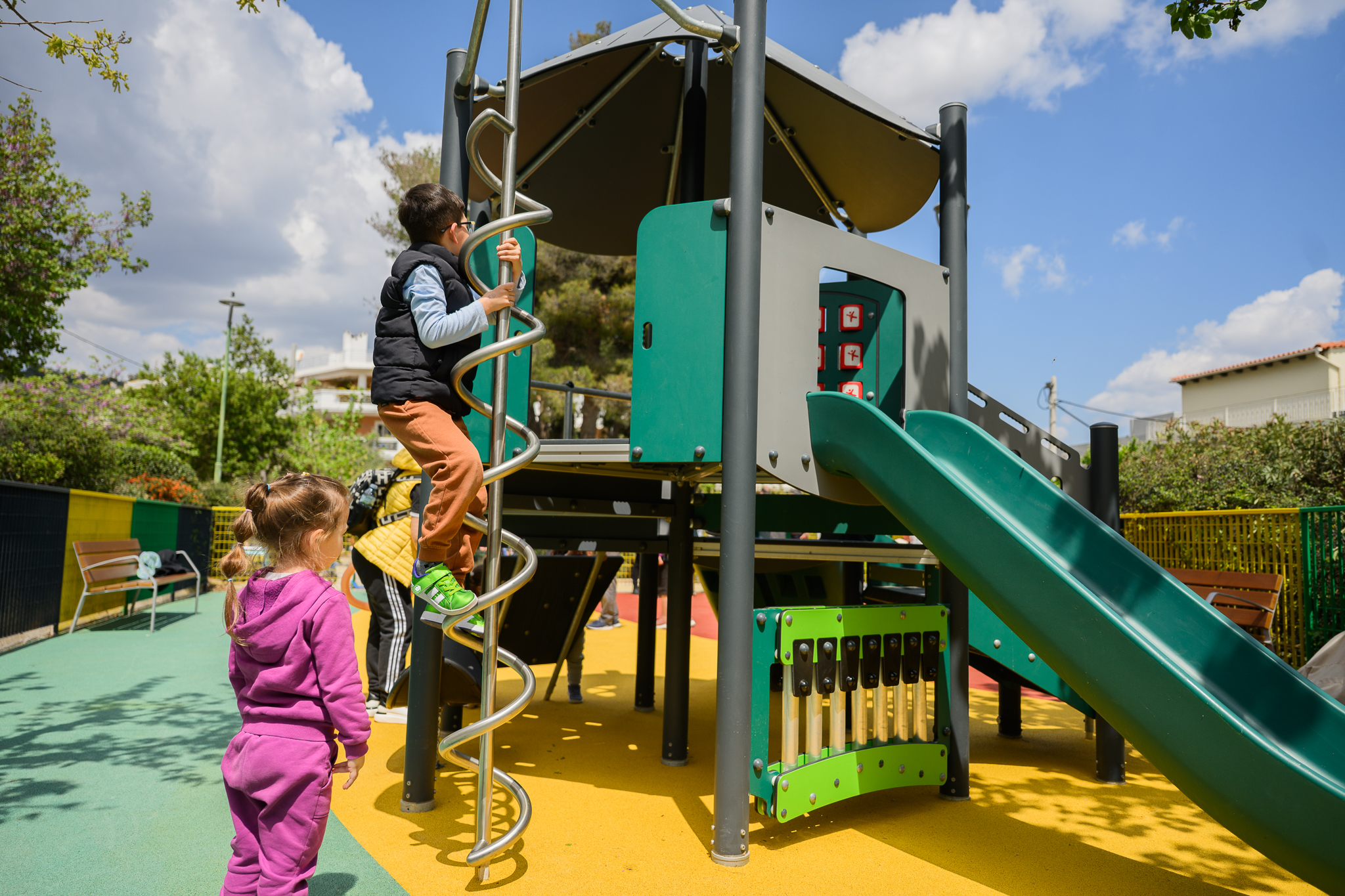 Παράλληλα, οι χώροι διαθέτουν καθιστικά για συνοδούς, πράσινο, σημεία σκίασης και βασικές υποδομές εξυπηρέτησης, δημιουργώντας ένα φιλικό και λειτουργικό περιβάλλον για καθημερινή χρήση από την τοπική κοινότητα.