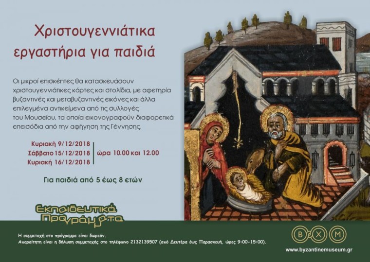 Το Σάββατο 15 και την Κυριακή 16 Δεκεμβρίου 10:00 – 12:00 θα πραγματοποιηθούν χριστουγεννιάτικα εκπαιδευτικά εργαστήρια στο Βυζαντινό και Χριστιανικό Μουσείο.Οι μικροί επισκέπτες θα κατασκευάσουν χριστουγεννιάτικες κάρτες και στολίδια, με αφετηρία βυζαντινές και μεταβυζαντινές εικόνες και άλλα επιλεγμένα αντικείμενα από τις Συλλογές του Μουσείου, τα οποία εικονογραφούν διαφορετικά επεισόδια από την αφήγηση της Γέννησης.