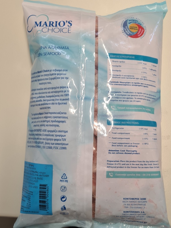 O Ε.Φ.Ε.Τ. και συγκεκριμένα η Περιφερειακή Διεύθυνση Αττικής, κατά τη διενέργεια ελέγχων στο πλαίσιο του Προγράμματος «Επίσημος Έλεγχος για την παρακολούθηση των επιπέδων των προσθέτων τροφίμων σε αλιεύματα» έτους 2021, προέβη σε δειγματοληψία τροφίμου με τα στοιχεία: “MARIO’S CHOICE, ΓΑΜΠΑΡΗ ΑΙΓΑΙΟΥ ΜΜ IQF”, με αριθμό παρτίδας 210113001 και ημερομηνία ανάλωσης 23/11/22, βάρους με επίπαγο 1000γρ και καθ. βάρους 850 γρ., το οποίο παράγεται από την εταιρεία «ΚΟΝΤΟΒΕΡΟΣ ΑΕΒΕ.» με έδρα στον Ασπρόπυργο Αττικής.