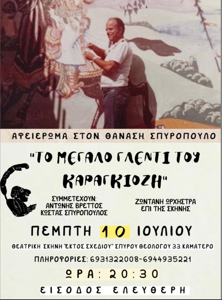 Ο Καραγκιόζης και τα καραγκιοζόπουλά του η Αγλαία η γυναίκα του ο Χατζηαβάτης και ο μπαρμπα- Γιώργος και όλοι οι άλλοι της γνωστής παρέας θα συναντηθούν σε ένα τιμητικό αφιέρωμα στον μεγάλο δάσκαλο της Τέχνης του Θεάτρου Σκιών, Θανάση Σπυρόπουλο, με παρουσίαση από τον μαθητή του, τον ταλαντούχο καραγκιοζοπαίχτη Αντώνη Βρεττό! Η είσοδος είναι ελεύθερη.
