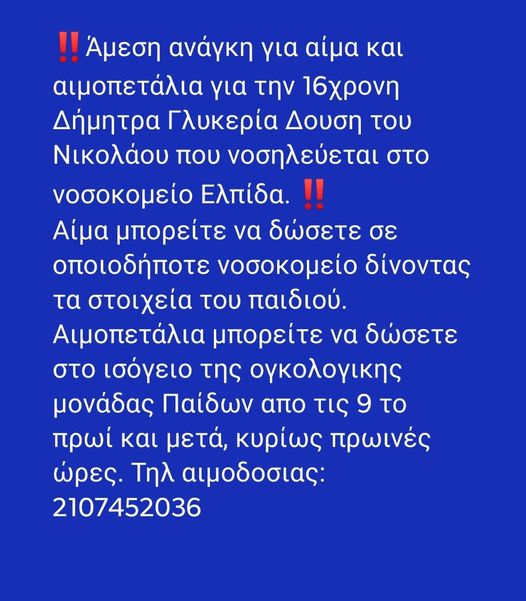 Έκκληση για αίμα και αιμοπετάλια απευθύνει η οικογένεια της 16χρονης Δήμητρας Γλυκερίας Δούσης που νοσηλεύεται στην Ογκολογική Μονάδα Παίδων Ελπίδα.