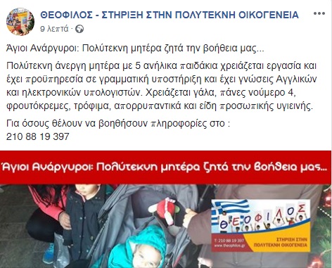 Ο Εθελοντικός Φιλανθρωπικός Οργανισμός Κοινωνικής Φροντίδας “Θεόφιλος” με ανάρτησή του στη σελίδα του στο Facebook μάς καλεί να συνδράμουμε στις ανάγκες μιας πολύτεκνης οικογένειας με πέντε παιδιά που αντιμετωπίζουν σοβαρά οικονομικά προβλήματα. Στο κείμενο της έκκλησης ζητείται εργασία για την μητέρα αλλά και είδη πρώτης ανάγκης για τα παιδιά.