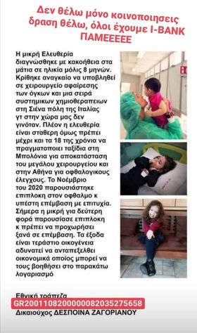 “Η μικρή πρέπει μέχρι και τα 18 της χρονιά να πραγματοποιεί ταξίδια κάθε χρόνο για οφθαλμολογικους ελέγχους στην Αθήνα και ελέγχους αποκατάστασης του μεγάλου χειρουργείου στη Μπολόνια τα έξοδα μεταφοράς διαμονής και περίθαλψης είναι τεράστια και αδυνατούμε να ανταπεξελθουμε σαν οικογένειά. Οπότε αυτό που ζητάμε είναι την βοήθεια του κόσμου για το διάστημα από δω και πέρα” εξηγεί η μαμά της.