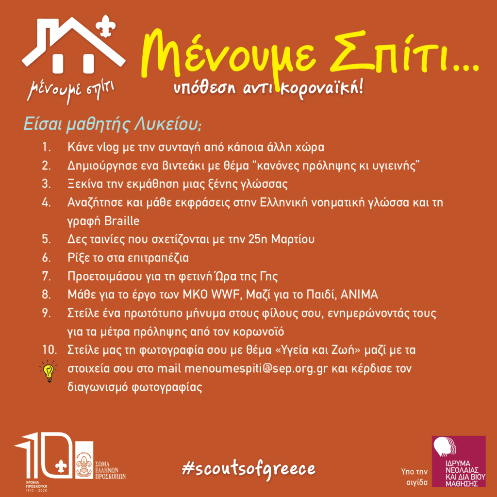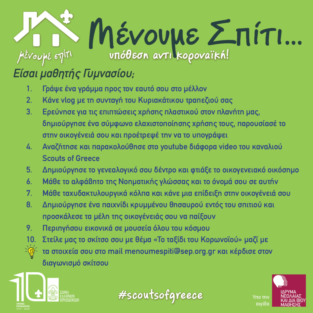 Προκειμένου να γίνει πιο ευχάριστη η παραμονή στο σπίτι οι Πρόσκοποι παρουσιάζουν (στο site τους) σε μέλη τους και μη, μια σειρά από ιδέες και ενέργειες προκειμένου μαθητές δημοτικού, γυμνασίου και λυκείου αλλά και ενήλικες να περάσουν δημιουργικά και αξιοποιήσουν τον χρόνο τους, με τίτλο: «Μένουμε σπίτι… υπόθεση αντι-κοροναϊκή!»: