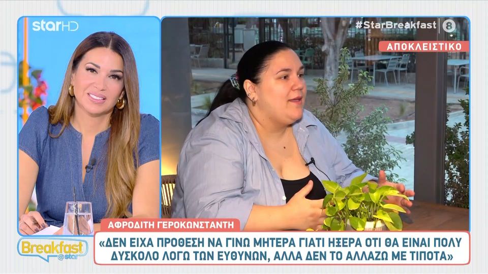 Η τραγουδίστρια δήλωσε στην κάμερα του «Happy Day» ότι συχνά δέχεται συγχαρητήρια επειδή περνάει χρόνο με το παιδί της: «Πολλές φορές ακούω μπράβο επειδή είμαι με το παιδί, αλλά εγώ θέλω να πω ένα μπράβο στις μαμάδες που αποφασίζουν να κάτσουν σπίτι και να είναι μόνο μαμάδες, γιατί αυτό είναι πολύ δύσκολο. Αυτό είναι πάρα πολύ δύσκολο, οπότε να πούμε ένα μπράβο σε αυτές τις γυναίκες».