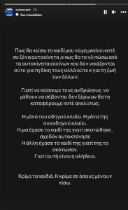 Η μάνα του οδηγού κλαίει. Η μάνα της συνοδηγού κλαίει. Η μία έχασε το παιδί της γιατί σκοτώθηκε, σχεδόν αυτοκτόνησε. Η άλλη έχασε το παιδί της γιατί της το σκότωσαν. Γιατί αυτή είναι η αλήθεια.