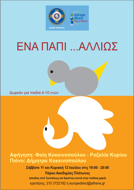 Το κέντρο ευρωπαϊκής πληροφόρησης του Δήμου Αθηναίων καλεί μικρούς και μεγάλους να παρακολουθήσουν την αφήγηση «Ένα παπί αλλιώς…», η οποία είναι βασισμένη στο παραμύθι του Δανού συγγραφέα Χανς Κρίστιαν Άντερσεν «Το ασχημόπαπο».
