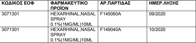 Την ανάκληση των παρτίδων F145060A και F149040A του γνωστού φαρμακευτικού προϊόντος HEXARHINAL,NASAL SPRAY HA 0.1%(1MG/ML) 10 ML με ημερομηνία λήξης 09/2020 και 10/2020 αντίστοιχα ανακοίνωσε ο Εθνικός Οργανισμός Φαρμάκων.