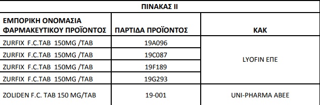 Την ανάκληση των παρτίδων των φαρμάκων που αναφέρονται στον ακόλουθο πίνακα ανακοίνωσε ο Εθνικός Οργανισμός Φαρμάκων (ΕΟΦ). Πρόκειται για φάρμακα τύπου Zantac που περιέχουν την “ύποπτη” ως καρκινογόνα ουσία, ρανιτιδίνη.