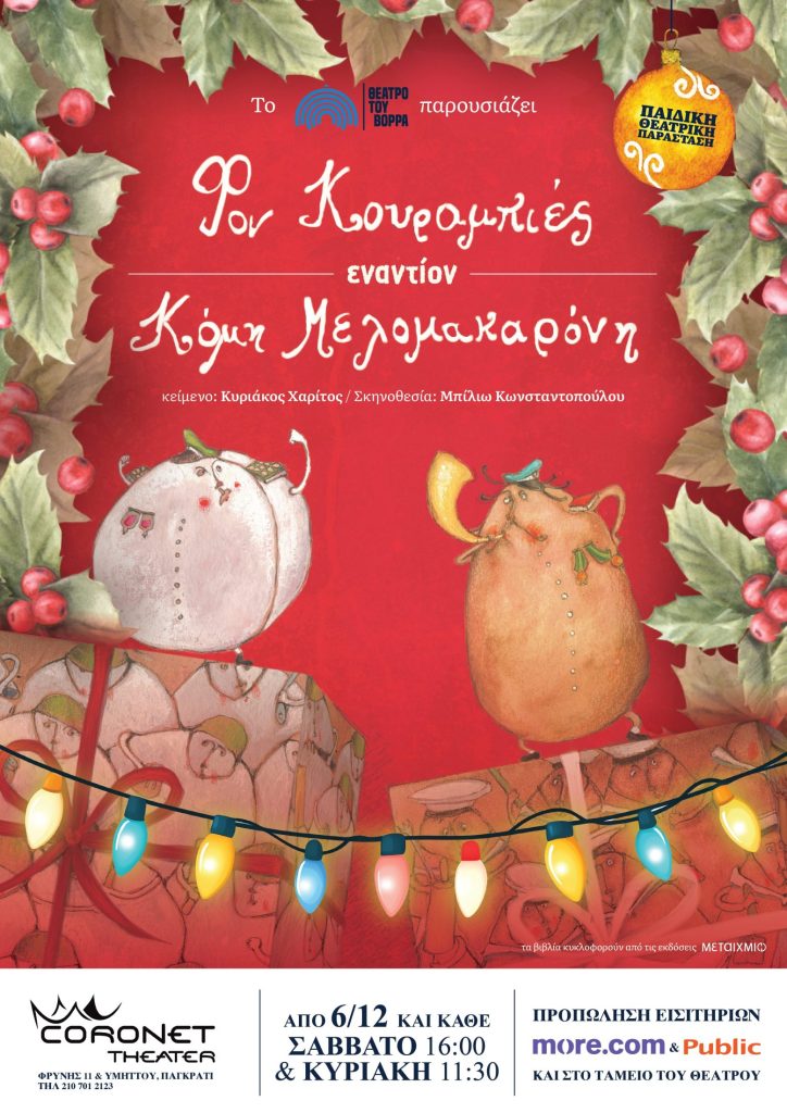 Αυτά τα Χριστούγεννα, η σκηνή γεμίζει με το άρωμα της ζάχαρης άχνης, του ροδόνερου, του μελιού και των καρυδιών! Το αγαπημένο βιβλίο μικρών και μεγάλων «Φον Κουραμπιές εναντίον Κόμη Μελομακαρόνη» ανεβαίνει για πρώτη φορά στο θέατρο, σε μια λαμπερή, χριστουγεννιάτικη παράσταση για όλη την οικογένεια.