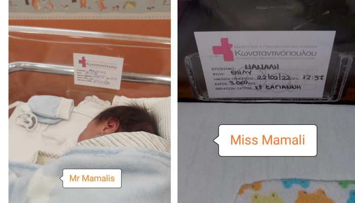 Τα δύο μωρά, που γεννήθηκαν την ίδια τυχερή ημέρα, σε διπλανά δωμάτια στην Κλινική Κωνσταντινόπουλου, έχουν ένα ακόμη κοινό χαρακτηριστικό. Εχουν το ίδιο επίθετο, Μάμαλη. Κι όμως δεν είναι συγγενείς και οι γονείς τους δεν γνωρίζονται μεταξύ τους. Ο Νίκος Μάμαλης είναι από τον Βόλο, ο Κωνσταντίνος Μάμαλης από τη Λαμία.