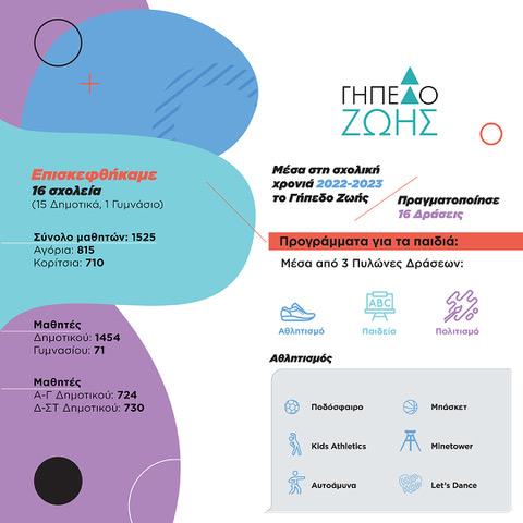 Τη σχολική χρονιά 2022-2023, η ομάδα του Γηπέδου Ζωής επισκέφθηκε 16 σχολεία (15 Δημοτικά και 1 Γυμνάσιο), οργανώνοντας εκδηλώσεις, στις οποίες συμμετείχαν 1.525 μαθητές. Η δράση του Γηπέδου Ζωής αναπτύσσεται γύρω από τον Αθλητισμό, την Παιδεία και τον Πολιτισμό, τρεις πυλώνες που παίζουν καθοριστικό ρόλο για την προσωπική, ακαδημαϊκή και τη μετέπειτα επαγγελματική πορεία των παιδιών, καθώς και για τη διαμόρφωση ενός δυνατού χαρακτήρα.