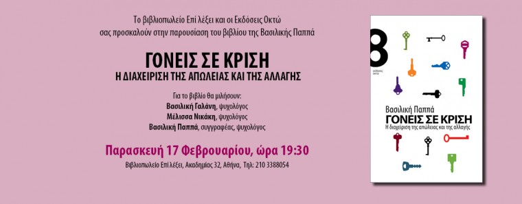 Οι Εκδόσεις Οκτώ σας προσκαλούν στην συζήτηση για το νέο βιβλίο της Βασιλικής Παππά “Γονείς σε κρίση: Η διαχείριση της Απώλειας και της Αλλαγής” την Παρασκευή 17 Φεβρουαρίου στις 19:30 το απόγευμα στο Βιβλιοπωλείο Επί Λέξει. Τι συνιστά κρίση για ένα παιδί; Πώς και με ποιους τρόπους μπορούμε να τα βοηθήσουμε να τη διαχειριστούν;