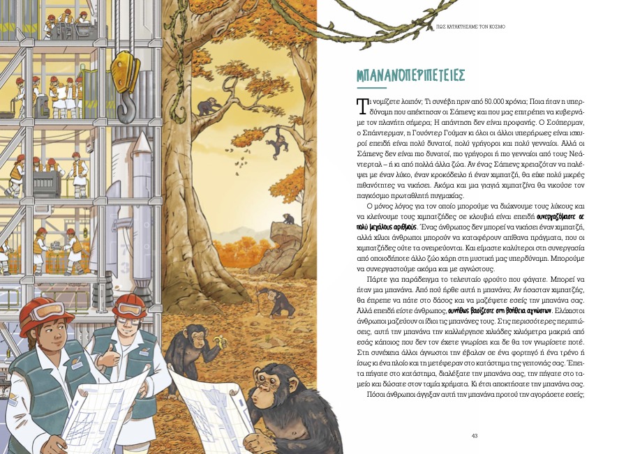 Ξεχάστε τις δυσνόητες έννοιες, πάρτε το βιβλίο, καθίστε αναπαυτικά σε μια πολυθρόνα και ετοιμαστείτε να απολαύσετε μια μοναδική αναγνωστική εμπειρία. Ακολουθήστε τους αρχαίους ανθρώπους στο ταξίδι που τους οδήγησε έξω από την Αφρική και μάθετε στην πορεία πώς η φωτιά συρρίκνωσε το στομάχι μας, τι μας λέει το ποδόσφαιρο για τους ανθρώπους και γιατί το χρήμα είναι το πιο πετυχημένο παραμύθι.