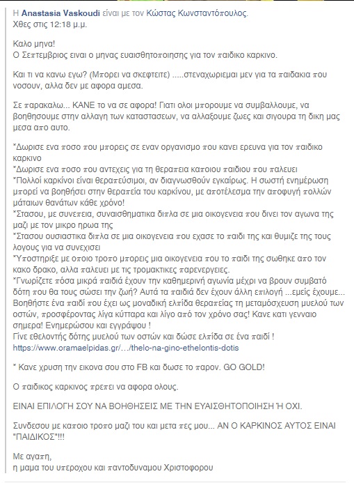 Η Αναστασία Βασκούδη, μητέρα του 5χρονου Χριστόφορου, με ένα κείμενο της στο Facebook στέλνει το δικό της μήνυμα αφύπνισης αλλά και ευαισθητοποίησης για το πώς μπορούμε να βοηθήσουμε τις οικογένειες που τα παιδιά τους δίνουν μάχη με τον παιδικό καρκίνο. Υπενθυμίζεται ότι 5χρονος ταξίδεψε στη γειτονιά των αγγέλων καθώς δεν τα κατάφερε στη μάχη που έδινε για να νικήσει το γλοίωμα εγκεφαλικού στελέχους, έναν από τους σπανιότερους παιδικούς όγκους του εγκεφάλου,