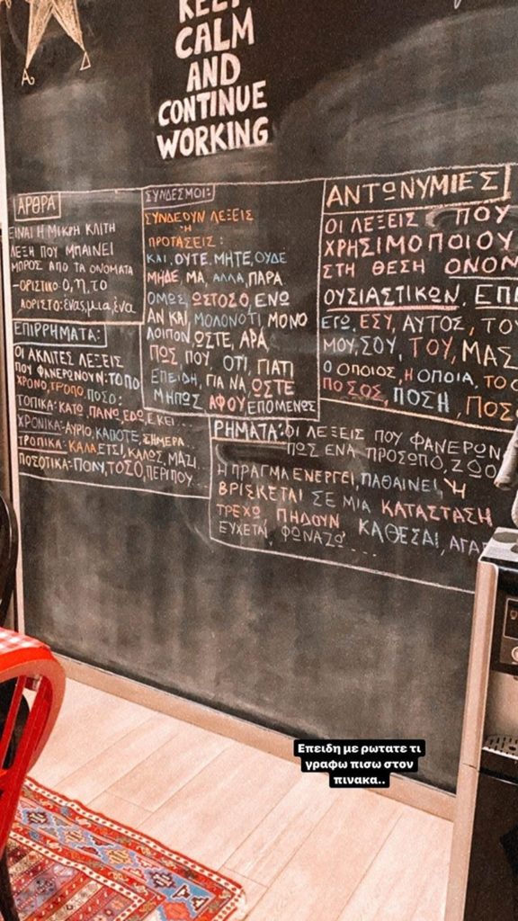 Αυτό λοιπόν που έχει τραβήξει την προσοχή των followers τις τελευταίες ώρες είναι ο μεγάλος πίνακας που έχει στο σπίτι της οικογένεια και που αυτή τη φορά έχει γραμμένους κανόνες γραμματικής προκειμένου να τους μαθαίνουν πιο εύκολα τα μεγαλύτερα παιδιά που πάνε σχολείο.
