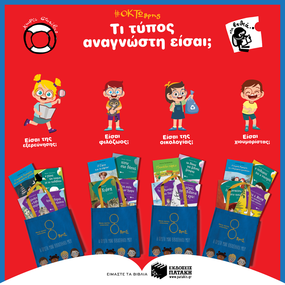 Οι εκδόσεις Πατάκη συνεχίζουν για δεύτερη συνεχόμενη χρονιά την επιτυχημένη τους δράση “8βρης – Μήνας Πρώτης Ανάγνωσης”, προσφέροντας στα παιδιά των πρώτων τάξεων του Δημοτικού την ευκαιρία να εμπλουτίσουν την προσωπική τους βιβλιοθήκη και να μυηθούν την μαγεία της φιλαναγνωσίας, με τον πιο οικονομικό τρόπο!