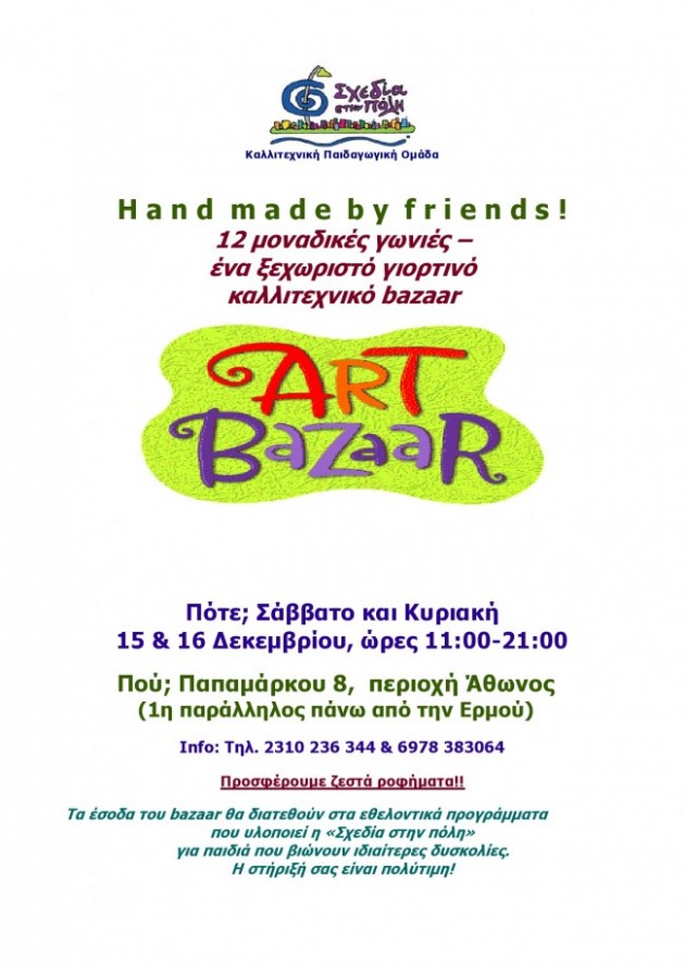 Σημειώστε την ημέρα και την ώρα: Σάββατο και Κυριακή 15 & 16 Δεκεμβρίου, ώρες 11:00-21:00 και φυσικά προσέλθετε. «Hand made by friends!»: 12 μοναδικές γωνιές όπου φίλοι δημιουργοί «μιλούν» για το χρόνο, τις προσωπικές αδυναμίες, τα μικρά μας φετίχ μέσα από τα αντικείμενα!!! Ένα ξεχωριστό γιορτινό καλλιτεχνικό bazaar στον καινούργιο μας χώρο της «Σχεδία στην πόλη», στην αγαπημένη γειτονιά της Άθωνος, Παπαμάρκου 8, στη Θεσσαλονίκη.