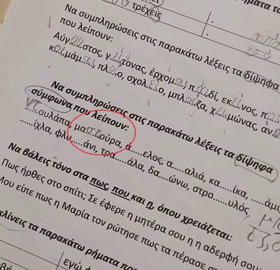 Στο επίμαχο φυλλάδιο η λέξη μαστούρα που επίλεξε να συμπληρώσει ο μαθητής προβληματίζει καθώς είναι μια λέξη που δεν αρμόζει να είναι στο λεξιλόγιο του καθώς η σωστή θα ήταν μαγκούρα.