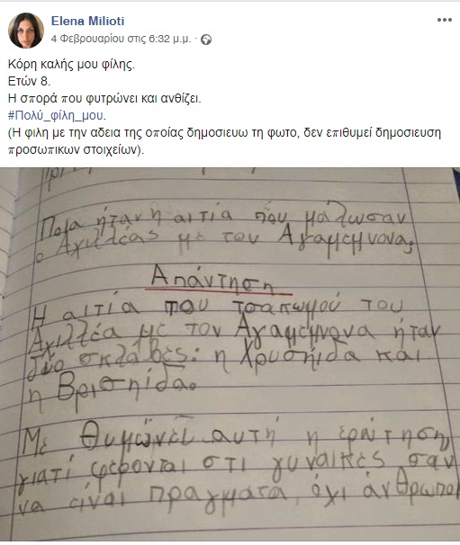 Η 8χρονη απάντησε ολόσωστα ότι “Αιτία του τσακωμού των δύο ηρώων ήταν δυο σκλάβες: η Χρυσηίδα και η Βρισηίδα.” Όμως ακριβώς από κάτω δεν δίστασε να κάνει και το δικό της σχόλιο για την εν λόγω αντιμετώπιση των γυναικών και γράφει τα εξής “Με θυμώνει αυτή η ερώτηση γιατί φέρονται στις γυναίκες σαν να είναι πράγματα, όχι άνθρωποι”.